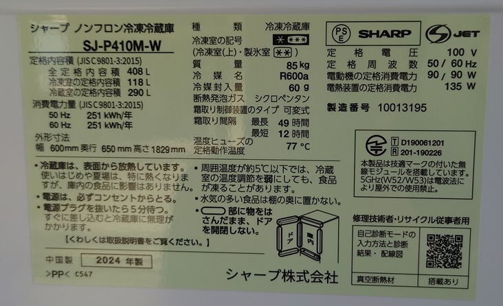 2024年製 SHARP冷凍冷蔵庫 408ℓ 両開きドア